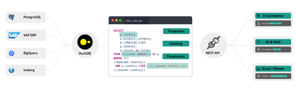 - Multiple Data Sources: Connect to BigQuery, SAP ERP & BW (via ERPL), Parquet, Iceberg, Postgres, MySQL, and more