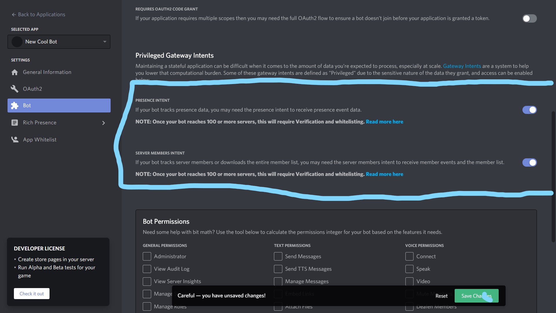 Keep this safe, and never share it with anyone! This token will be useful later! After you've gotten your token, scroll down a bit and turn on prescence and server member intents. This will be useful for serverinfo commands
