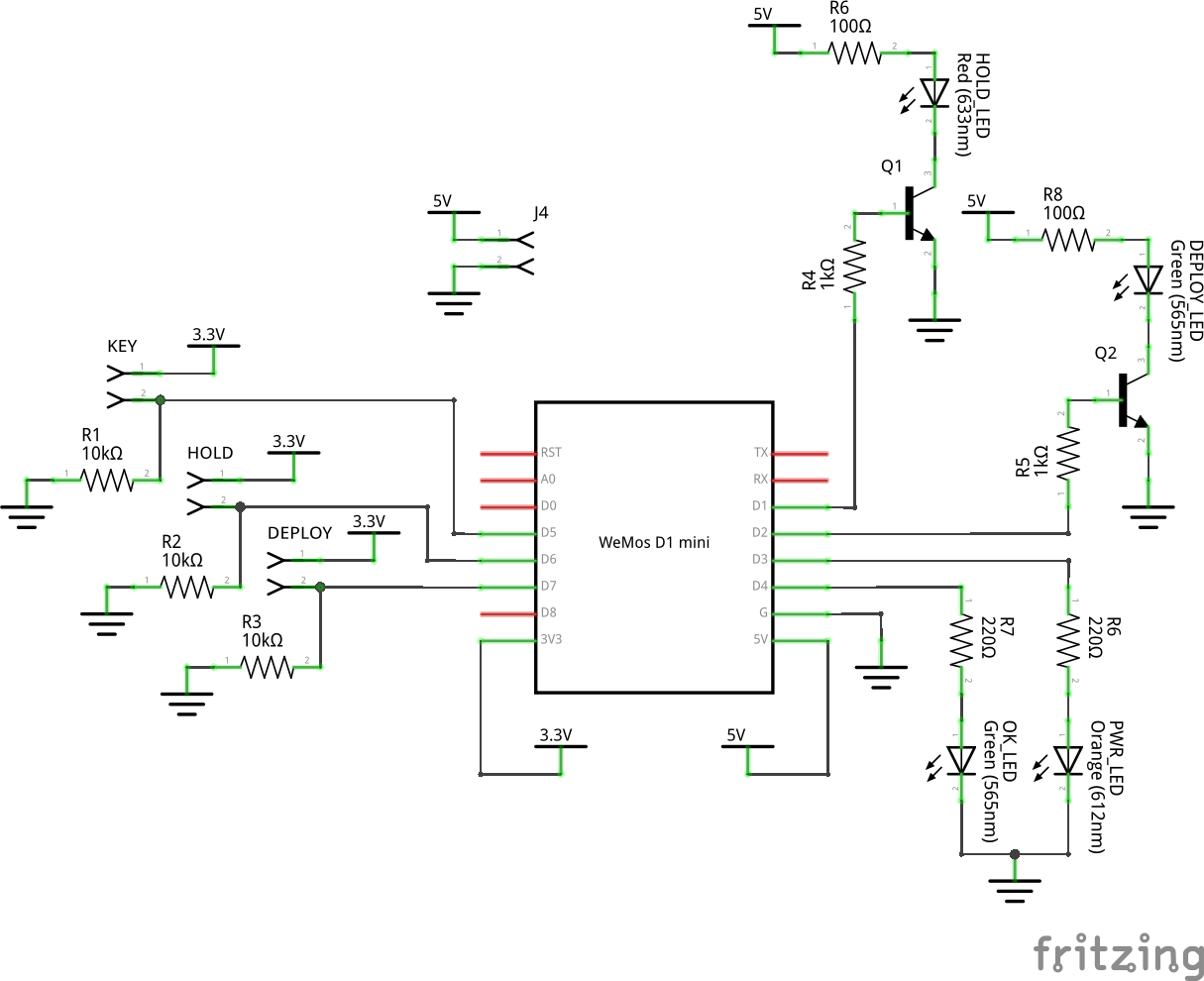 The ESP will only provide 20mA per pin, so make sure you calculate your resistor values appropriately to not overcook it. The oversized automotive push-buttons I used for the hold and deploy buttons needed > 5v, so had to be controlled via a couple of small NPN transistors.