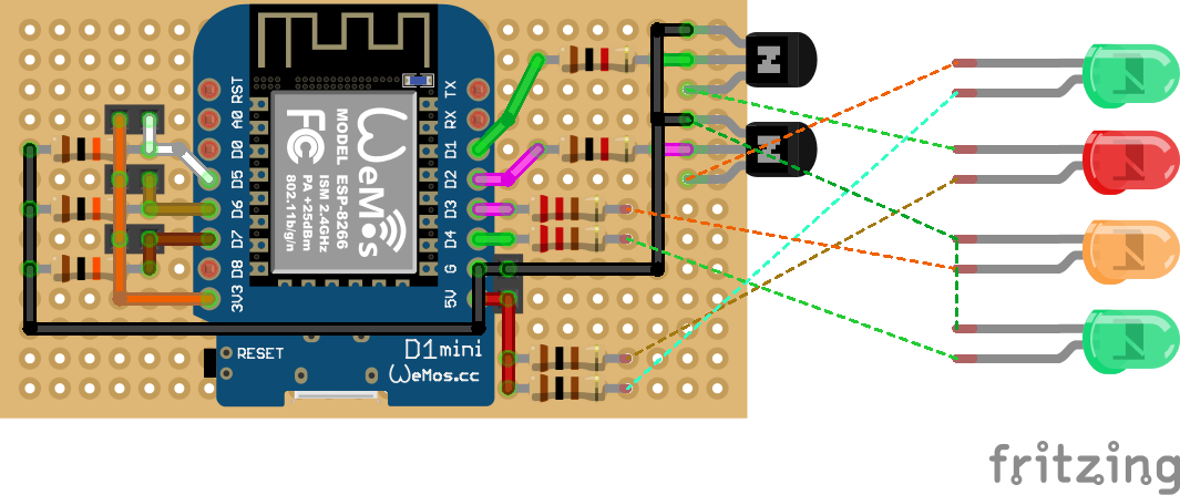 Using an ESP development board like the Wemos D1 mini quite simple. Here's a suggested protoboard layout:
