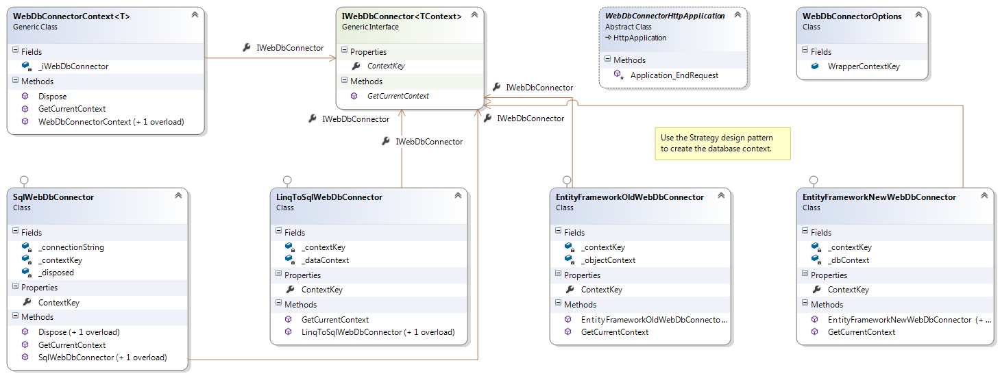 }Use the WebDbConnector for the Entity Framework ObjectContext, we also create the DatabaseContext class as SqlConnection Ado.Net:
