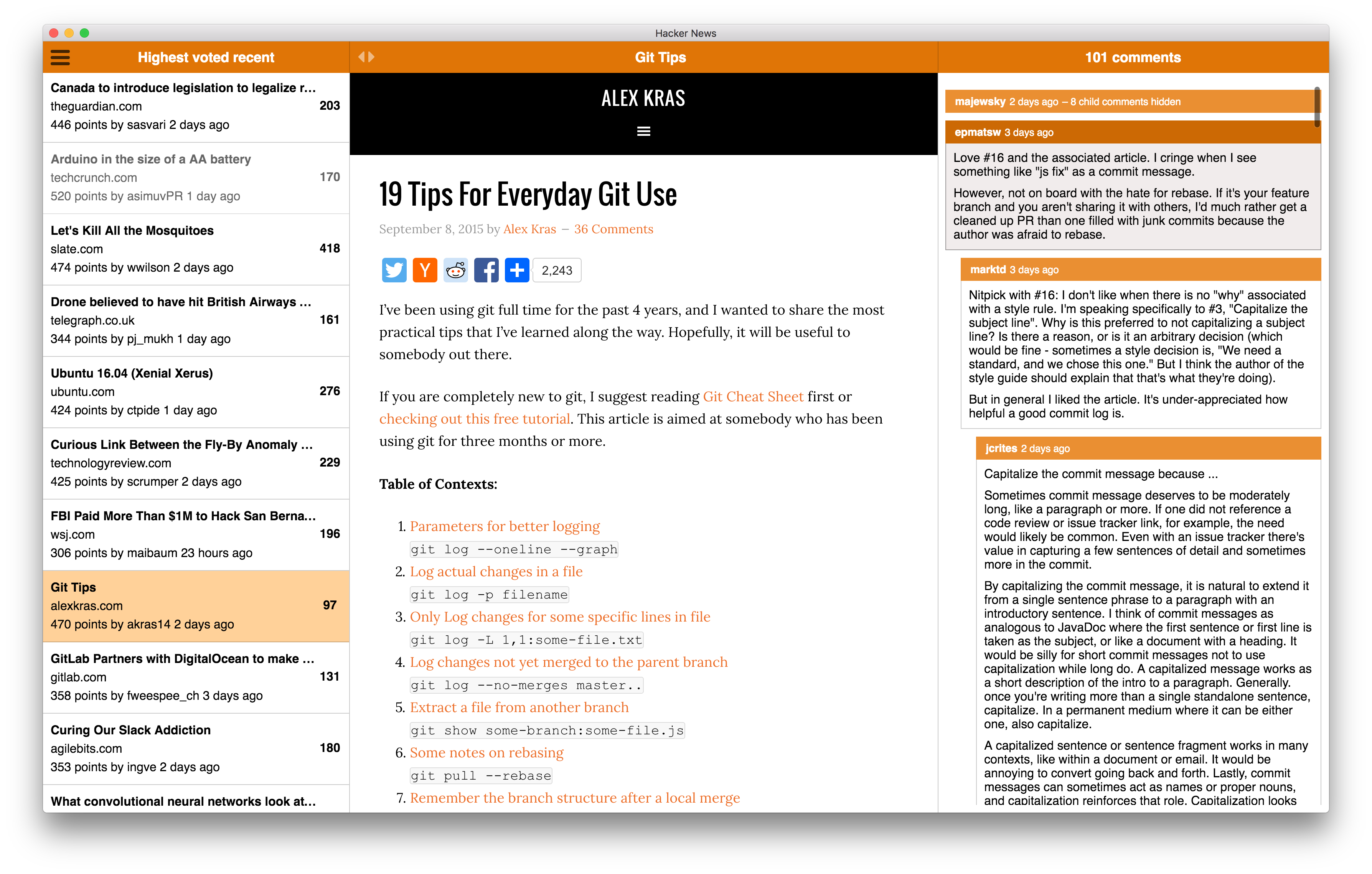 This app lets you comfortably read Hacker News without having to open an endless amount of tabs anymore. You can choose articles to view from a sidebar and can optionally read articles and their comments next to each other on a split screen. The app works on Mac, Linux and Windows.