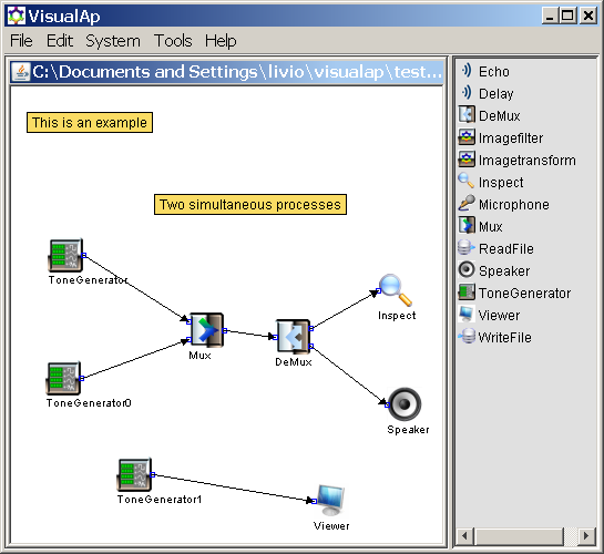VisualAp can be used in order to perform audio processing, image processing, text and other process-driven emulation. VisualAp provides a visual framework based on lightweight components, called proclet.