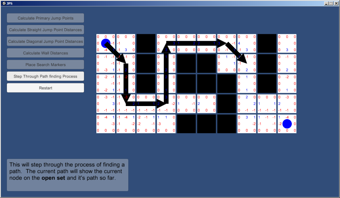• After the grid is created, the user can be begin the precomputation process. This process will calculate jump points, jump point distances, and goal bounds.